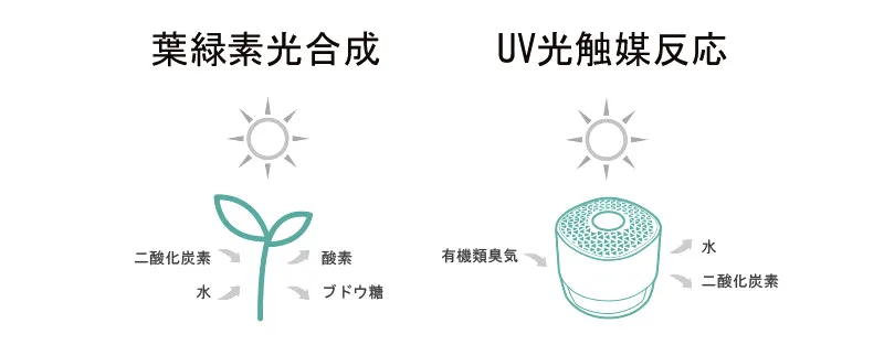 植物の光合成と似た過程を用いて、空気中のニオイ分解を行います。