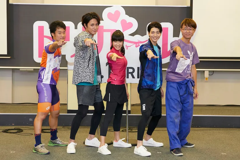 左から重松諒さん(TBTパイロット/工学部機械機能工学科 3年)、間宮祥太朗さん、土屋太鳳さん、高杉真宙さん、池端純一さん(TBT代表/工学部機械機能工学科 3年)