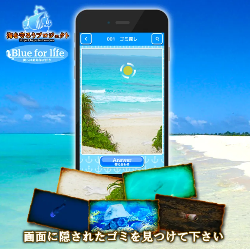 『Blue for life 僕らは結局海が好き』は、見ているだけでも癒やされる綺麗な海の画面の中に、それを台無しにする「ゴミ」がどこかに隠されています。プレイヤーはそのゴミを「間違い探し」感覚で見つけ出すゲームです。