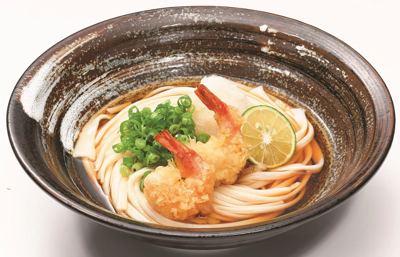 サクサク食感が楽しい揚げたての海老天、さっぱりと食せるすだちと大根おろしをそえて・・・。うどんとダシのおいしさを味わえる至福の1杯です。