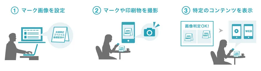 画像の特徴を抽出、照合し、その結果に紐付けられた電子コンテンツを取り出すことで、紙などの画像とウェブサイトや動画などマルチメディアコンテンツをリンクすることができる技術です。あらかじめマーカー内の画像から抽出された特徴量と電子コンテンツの組をサーバーに登録しておき、スマートフォンで撮影されたマーカーの画像から同様に抽出された特徴量と照合することで、そのマーカーに関連付けられた電子コンテンツを特定することを可能にしています。