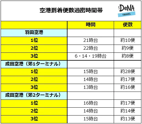 オンライン総合旅行サービス「DeNAトラベル」(URL:http://www.skygate.co.jp/)を運営する株式会社DeNAトラベル(本社:東京都新宿区、代表取締役社長:中野 正治、以下DeNAトラベル)は、羽田空港と成田空港の8月の到着便時刻表を元に、空港の到着ターミナルが最も込み合う時間帯を調査しました。