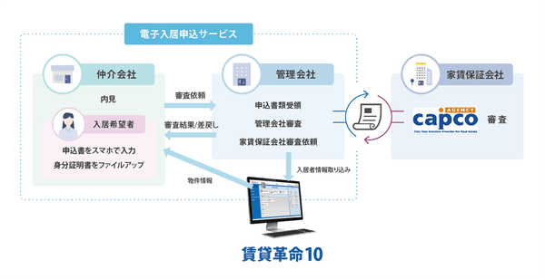 不動産テックの日本情報クリエイト株式会社(本社:宮崎県都城市、代表取締役社長:米津 健一、以下「日本情報クリエイト」)がクラウドで提供する「電子入居申込サービス」と株式会社 CAPCO AGENCY(本社:愛知県名古屋市、代表取締役社長:髙嶋 明徳、以下「CAPCO AGENCY」)は、電子入居申込サービスのデータを活用した家賃保証サービス申込に関する提携を開始しました。