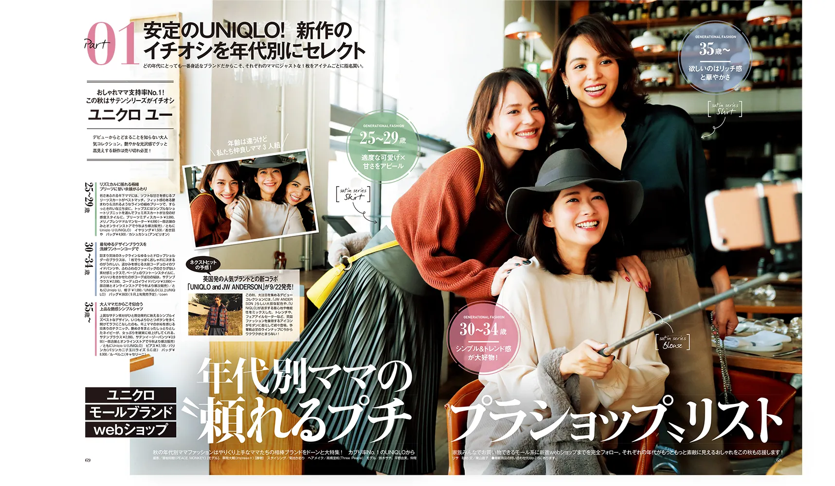 秋の年代別ママファッションはやりくり上手なママたちの相棒ブランドをドーンと大特集!カブり率No.1のUNIQLOから家族みんなでお買い物できるモール系に新進webショップまでを完全フォロー。それぞれの年代がもっともっと素敵に見えるおしゃれをこの秋も応援します!
