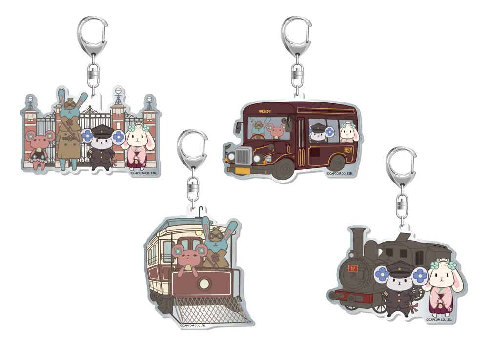 アクリルキーホルダー4種(学校正門、バス、電車、SL) 各760円