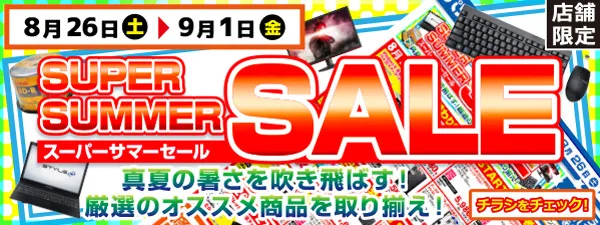 パソコン工房・グッドウィルの各店では、8 月26 日(土) からも引き続き「スーパーサマーセール」を開催中です。厳選のオススメ商品を取り揃え!8 月26 日(土)・27 日(日)限定の特価品もご用意しています。