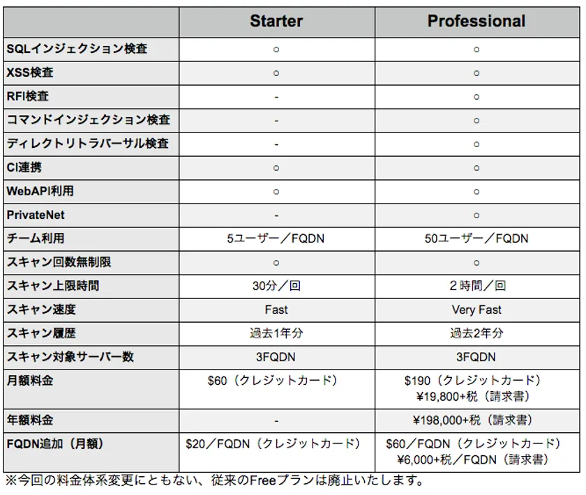 ・Standardプラン(月額$100)を廃止し、Starterプラン(月額$60)を新設します。検査項目をSQL injection検査とクロスサイト・スクリプティング(XSS)検査のみに限定することによって、旧Standardプランよりもお求めやすい価格でご利用いただけます。