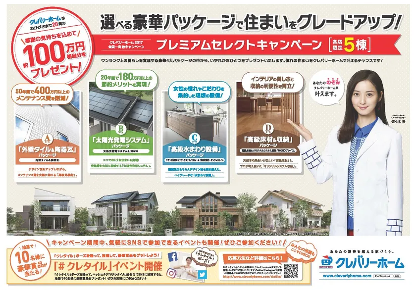 2017年9月1日 11:00コミュニケーションワード「あなたの期待を超える家づくり。」を掲げ、北は北海道から南は九州・沖縄まで、全国47都道府県にモデルハウスをオープンさせ、170の営業拠点を展開するクレバリーホーム(株式会社 新昭和FCパートナーズ、代表取締役:井上家 進)では、クレバリーホーム誕生20周年の感謝の気持ちを込めて、豪華パッケージを選んで住まいをグレードアップできる「プレミアムセレクトキャンペーン」を2017年9月8日(金)より、全国のクレバリーホームにて開催いたします。