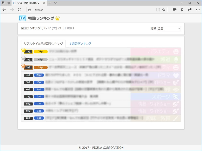 ピクセラ、Win/Mac/iOS/Android向けテレビ製品の 『テレビ視聴データサービス』を 2017年8月31日よりWeb公開 クラウド活用で「いつでも」「だれでも」「どこでも」 テレビ番組利用率の今が分かる