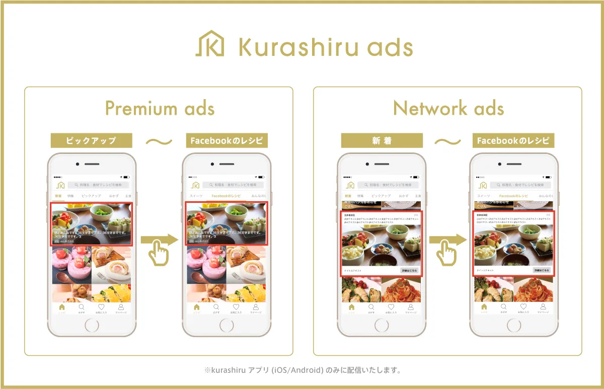 kurashiru adsでは、クラシルの広告掲載領域の最上部に配信できる「Premium Ads」(純広告)、インフィード型の広告メニュー「Network Ads」(運用型広告)の2種類を提供いたします。いずれも動画・静止画ともに配信可能となっております。