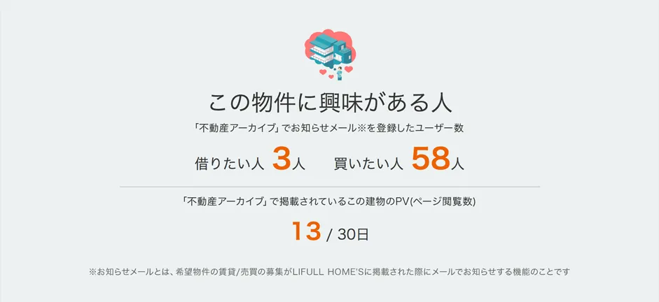 「LIFULL HOME'S」では、現在募集を行っていない物件も含めた、不動産物件データベースを「不動産アーカイブ(http://www.homes.co.jp/archive/)」として公開しており、住み替えや不動産運用の参考情報として様々なかたちでご利用いただいています。このたび「見える!不動産価値」で公開を開始する募集待ち数および閲覧数は「不動産アーカイブ」の利用状況に基づくもので、対象の物件を「借りたい/買いたい」人の数と、物件ページの閲覧数を表示します。表示項目の詳細は以下のとおりです。