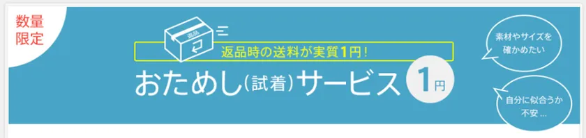 ECサイトをご利用いただく際に、お客様から「素材やサイズを確かめてから買えたらいいのに」「自分に本当に似合うか不安で買うのに躊躇してしまう」といった声をいただくことがあります。「おためし(試着)サービス」ではこれらのお悩みを解消するべく返品送料はお客様負担わずか1円となっており、ご自宅で気軽に試着いただくことができます。