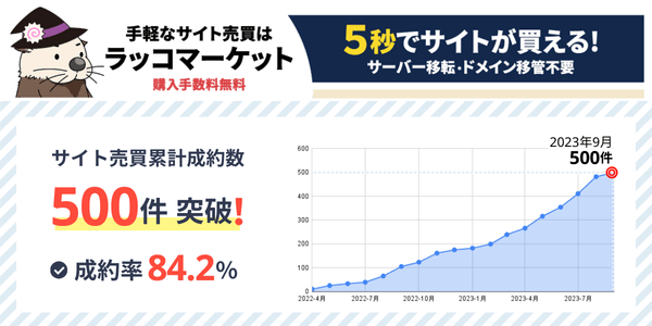 ラッコ株式会社(本社:東京都渋谷区)が運営するリアルタイムのサイト売買プラットフォーム『ラッコマーケット』は、2023年9月に累計成約数が500件を突破しました。2023年になってから顕著な成長を見せており、当社が提唱する「リアルタイムサイト売買」が根付く兆しを感じています。