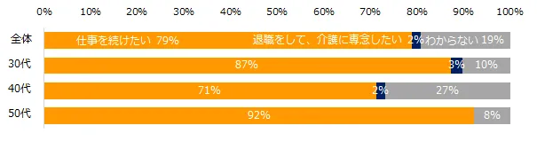 「介護の必要に迫られた場合、仕事を続けたいと思いますか?」と質問したところ、「仕事を続けたい」と回答した方が79%と圧倒的な割合を占めました。年代別に見ると、50代がもっとも高く92%の方が「仕事を続けたい」と回答しました。「仕事をしなければ介護のための費用を維持できないから」という経済的な理由を挙げる声が多く寄せられています。