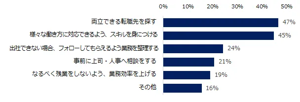 「ある」と回答した方に、具体的に準備していることを質問すると第1位は「両立できる転職先を探す」(47%)、第2位は「様々な働き方に対応できるよう、スキルを身につける」(45%)でした。