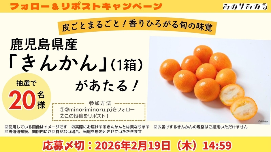また、2月14日(土)から2月19日(木)の期間、「みのりみのる公式X」では「鹿児島県産きんかん(1箱)」が当たるプレゼントキャンペーンも実施します。