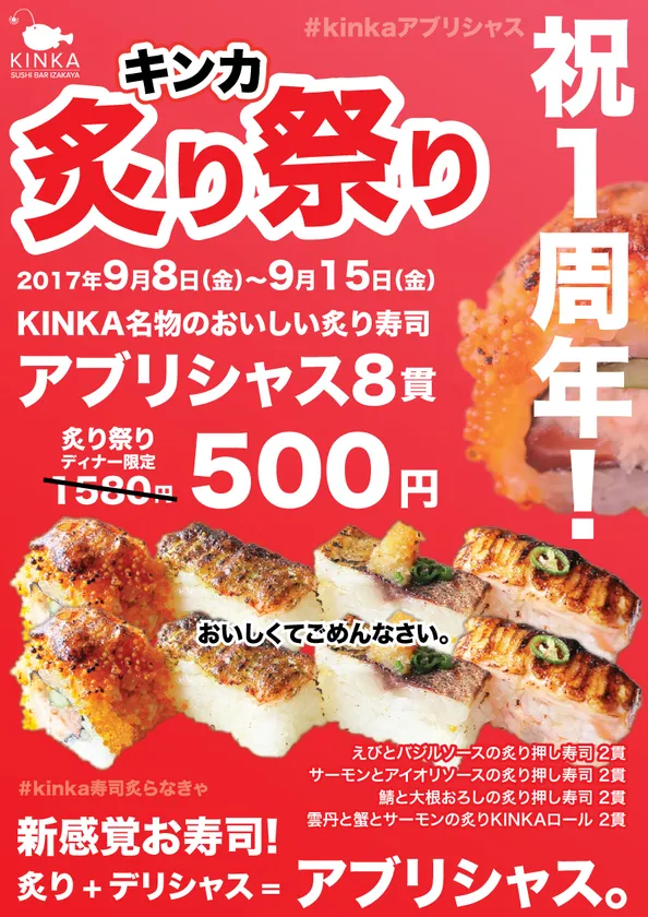 このたび、2017年9月15日に1周年を迎えるKINKAはお客様・業者様・関係者様・関わる全ての方への感謝の気持ちを込めて『炙り祭り』を開催します。