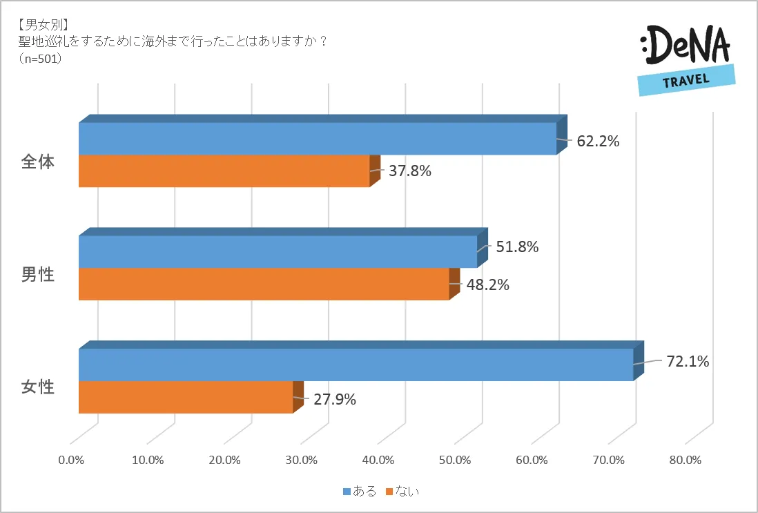 全体で「はい」と答えているのは62.2%。海外の聖地へも積極的に訪れる人が多いことが分かります。また、男女別に見ると大きく違いが見られ、女性で海外まで聖地巡礼に行く人は72.1%。男性の51.8%に比較すると、女性のほうがより海外の聖地へ訪れる傾向がうかがえます。
