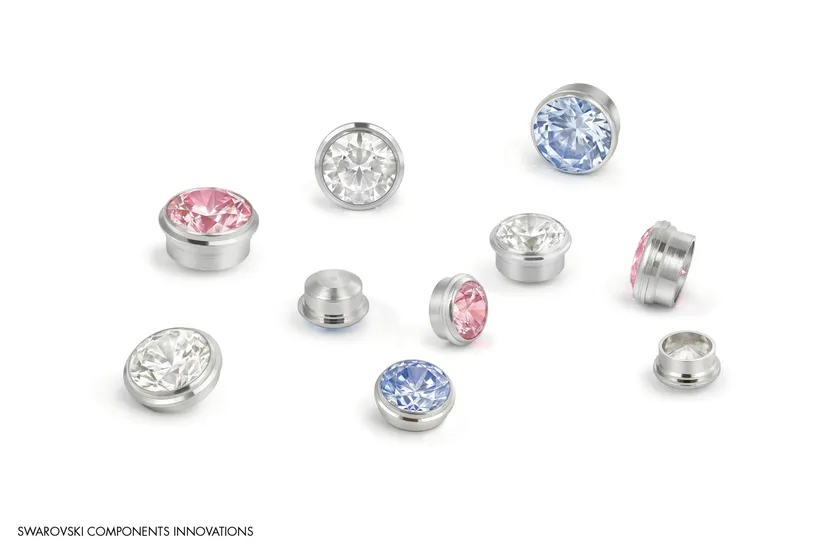 スワロフスキーがカットと研磨を行った天然石および合成石に、薄い金属の枠が装着されているもので、特別なスキルを必要とせずに、ステンレス鋼、チタン、革、木材、プラスチックなどの素材と簡単に組み合わせることができるパーツです。ジュエリー、腕時計、アイウェア、コンシューマーエレクトロニクスのデザインに、美しい輝きを簡単に取り入れることができる革新的なアイテムです。