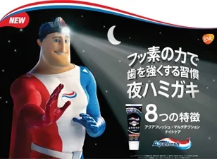 3色のヘアスタイルと輝く白い歯がトレードマークの「キャプテン アクアフレッシュ」。彼の使命は、わたしたちの生活と切り離せない糖分と闘い、お口の平和を守ること。「アクアフレッシュ マルチアクション ナイトケア」の新CM「夜の闘い篇」では、「キャプテン アクアフレッシュ」が、昼間だけでなく、世界が眠りにつく夜の間も休むことなく糖分と闘いつづけます。「アクアフレッシュ マルチアクション ナイトケア」を使うことで、フッ素※1が時間をかけてエナメル質に浸透し、ムシ歯を予防。強く健康な歯に導きます。おやすみ前の歯のケアは、「アクアフレッシュ マルチアクション ナイトケア」にお任せ。就寝前にリラックスできる、7種類のメディカルハーブミントの香味です。