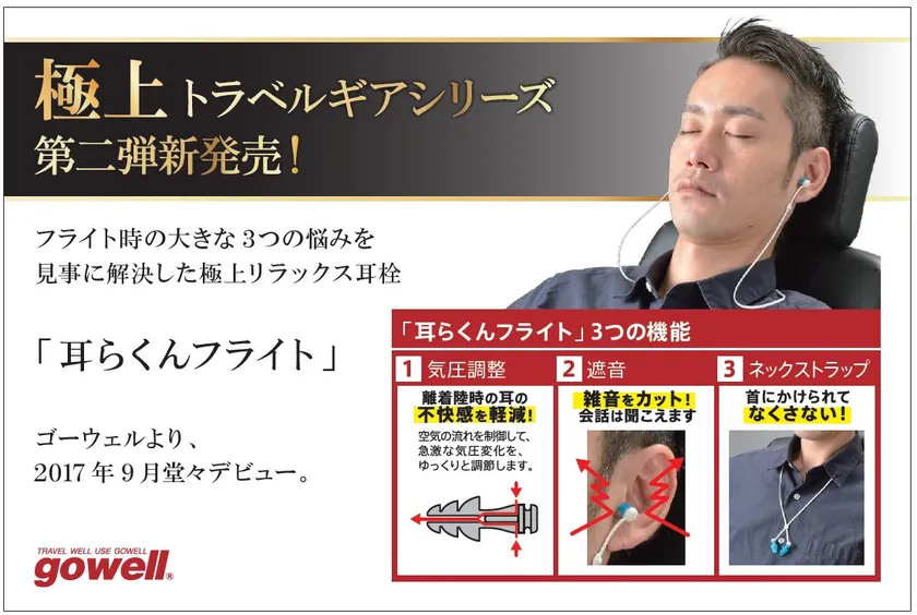 株式会社トレードワークス(本社:東京都渋谷区、代表取締役社長:千葉 啓一)は、このたびオリジナルトラベル雑貨ブランド「gowell(ゴーウェル)」から、極上トラベルギアシリーズ第二弾として新機能付き耳栓『耳らくんフライト』を2017年9月上旬より順次販売を開始いたします。