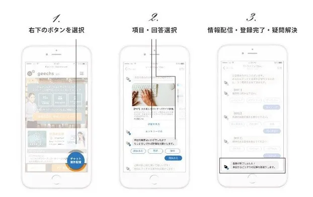 「geechs job」・「geechs magazine」のサイト、画面上に表示される「Facebook Messengerボタン」をタップし、各アカウントにて登録後に利用可能となります。