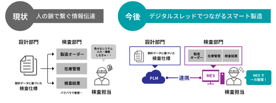 以上3点のさらなる体制強化をすべく、要求仕様と検査仕様を統一したデータモデルで管理できる PLM(Teamcenter X)システムと(Teamcenter X)、リアルタイムな製造プロセス管理ができるMES(Opcenter)を導入することとしました。