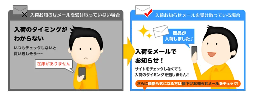 これまで、ブックオフオンラインでは欲しい商品が入荷した際や、欲しい商品が希望する販売価格以下に値下げした際などのお知らせは、お客様の登録メール宛に配信してまいりました。ただし、近年、ケータイキャリアやPCメールのスパムフィルターが厳しくなり、お客様ご自身で端末の受信設定をする必要や、受信していたにも関わらずメールがその他に紛れて見過ごしてしまう可能性もございました。