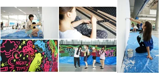 他にも、美術系学生ボランティアによるオブジェ制作、子どもたちに絵を描くことを楽しんでもらうプロジェクト、お客様の気分を盛り上げるボディペイントなどを行っています。今年はクリエイターの作品をデザインに落とし込んだTシャツなども制作しています。