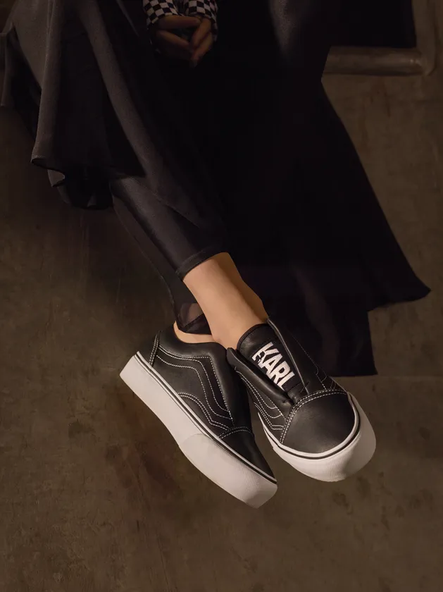 日本国内では、キルティングが施されたブラックのSLIP-ONをはじめ、カールの横顔の総柄プリントが施されたSLIP-ON、中央に「KARL」の文字があしらわれたOLD SKOOLのレースレスプラットフォーム、サイドのキルティングが目を引くSK8-HIのレースレスプラットフォームといった4型のコラボレーションシューズを販売。いずれのシューズもモノトーンのシックなデザインで、靴ひもがないレースレス仕様となっています。