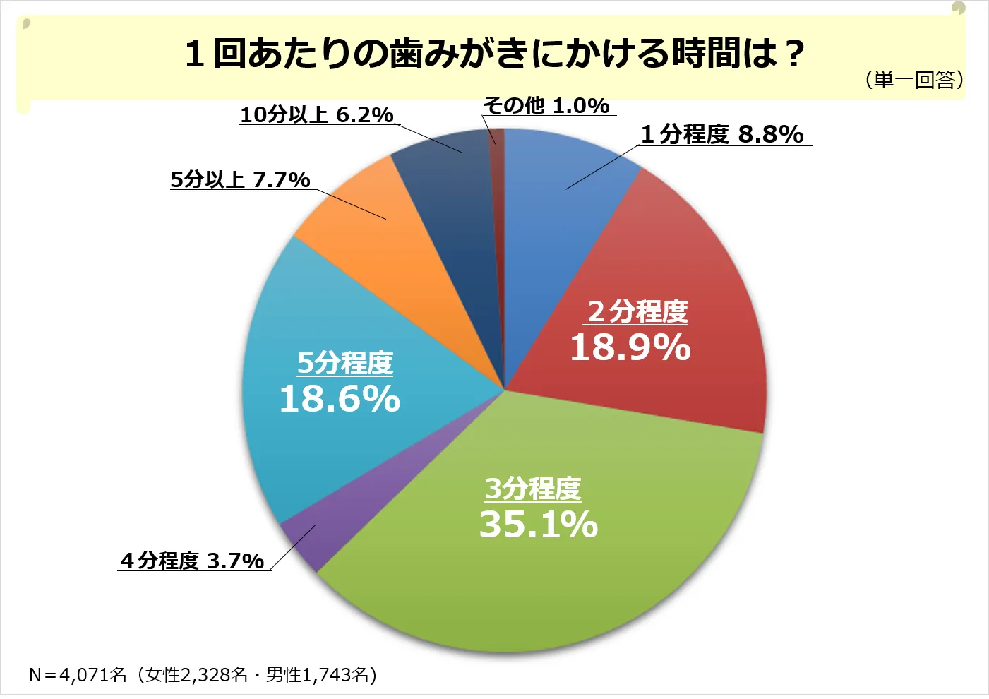 次に、1回あたりの歯みがきにかける時間について聞いてみました。