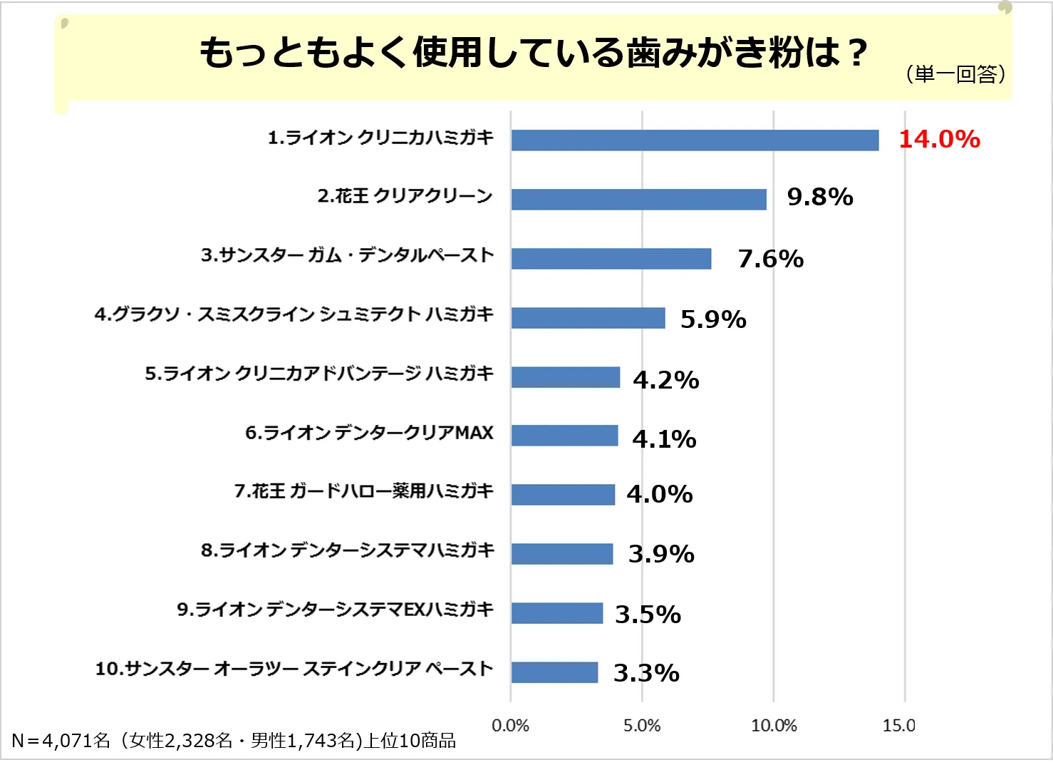 定期歯科健診で専門家による歯みがき指導や予防措置は大切ですが、毎日のセルフケアも大切ですよね。みなさんが愛用している「歯みがき粉」の銘柄について聞いてみました。