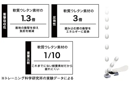 「パワークッション」に弾性のある特殊な樹脂を添加。従来の軽量性は保ちつつ、高い衝撃吸収性を実現します。格子状に+型の溝を最適な間隔と深さで配置し、さらなる反発性を達成しました。