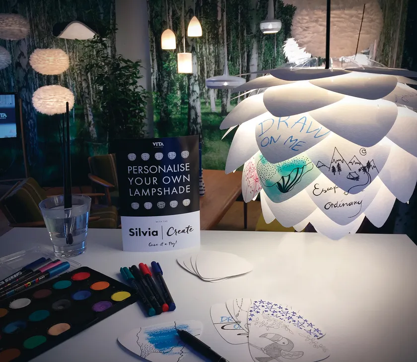 手軽な価格で手に入る北欧照明として人気の高い、デンマークのVITA Copenhagen(ヴィータ コペンハーゲン)。「Silvia mini create(シルヴィアミニ クリエイト)」は、国内外でも最も人気の「Silvia」シリーズの最新モデルです。ドローイングしたりメッセージを書いたり、好きなデザインをプリントアウトしたり、アイデア次第で自由にオリジナルのシェードをクリエイト(創作)できる今までにはない照明です。自身で作り出した照明は、あかりを灯すことでひときわ愛着のあるインテリアとなるでしょう。