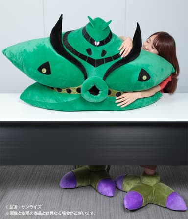 本商品は、円盤のような胴体に2本の脚部を持つ特徴的な「ビグ・ザム」を横幅約95cmの巨大サイズでクッション化し、同シリーズ他機体とは一線を画すクッションとなっています。クッションとしても程よい弾力を持ち、睡眠や休憩時に深くモフモフ「ひとやすみ」する上で、最適な弾力となっています。