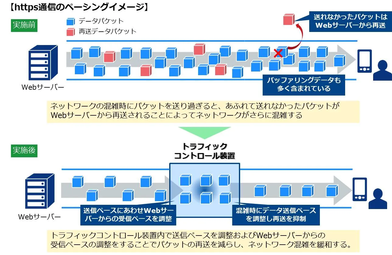 https通信で動画視聴など大容量の通信を行う際、Webサーバーからデータパケットを送信しますが、混雑時などにパケット再送が発生し、これによりネットワーク全体を流れるパケット量が増大して通信速度低下の一因となります。しかしトラフィックコントロール装置の「https通信のペーシング」機能を利用すれば、パケットを適切なペースで送出することにより、再送を抑制してネットワーク全体を流れるパケット量を適切に保つことが可能です。これにより、「OCN モバイル ONE」ご利用者全体の通信速度改善に貢献します。