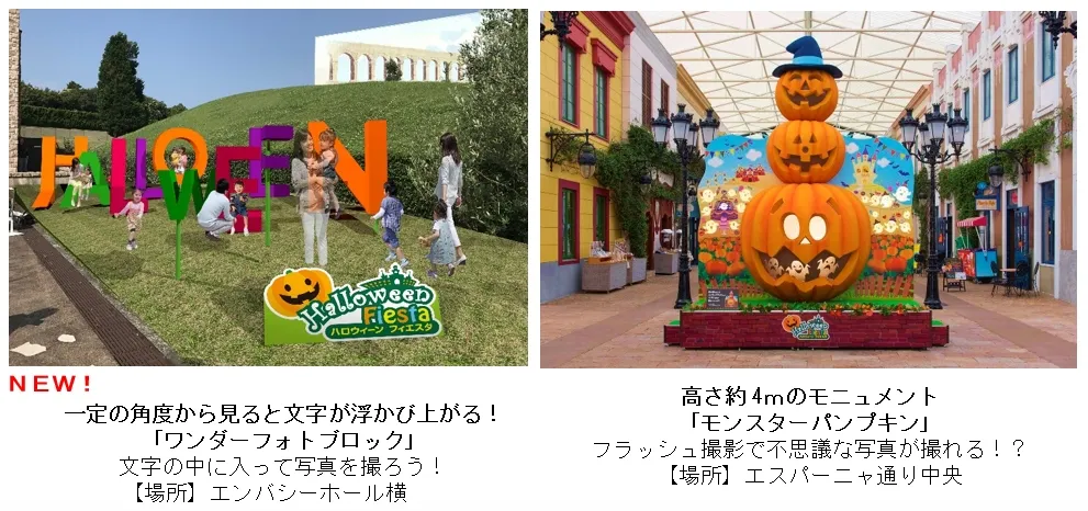 不思議な形をしたブロックをある角度から撮影すると「HALLOWEEN」の文字が浮かび上がる新フォトスポット「ワンダーフォトブロック」や、フラッシュ撮影で不思議な写真が撮れる高さ約4mのカボチャのモニュメント「モンスターパンプキン」が登場します。