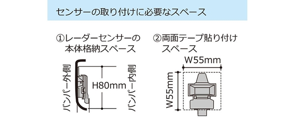 従来の超音波式センサーはバンパーへの穴あけが必要であったが、本製品はバンパーの裏側に張り付けるだけの簡単装着。検知精度も非常に高く、雨・霧や夜間時の明るさなどの影響を受けにくいと、まさに良いこと尽くめ!