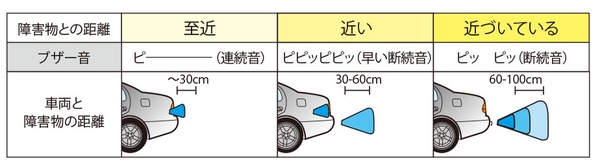 リバースギアに連動して自動的に動作を開始。障害物までの距離に応じて、3段階のブザー音で通知をします。