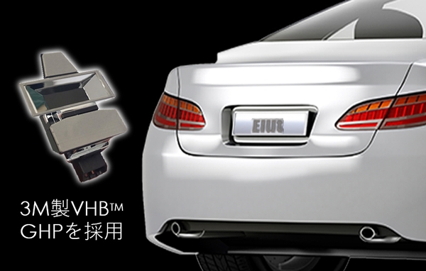 ・両面テープはリベット、溶接、ネジ等の代わりに使用される、3M製VHB™GPHを採用。さらにバンパー素材(ポリプロピレン)との接着力を通常時の約5倍※に向上させるプライマーを同梱。塗布により大幅な接着性能・耐久性を実現。※自社調べによる。