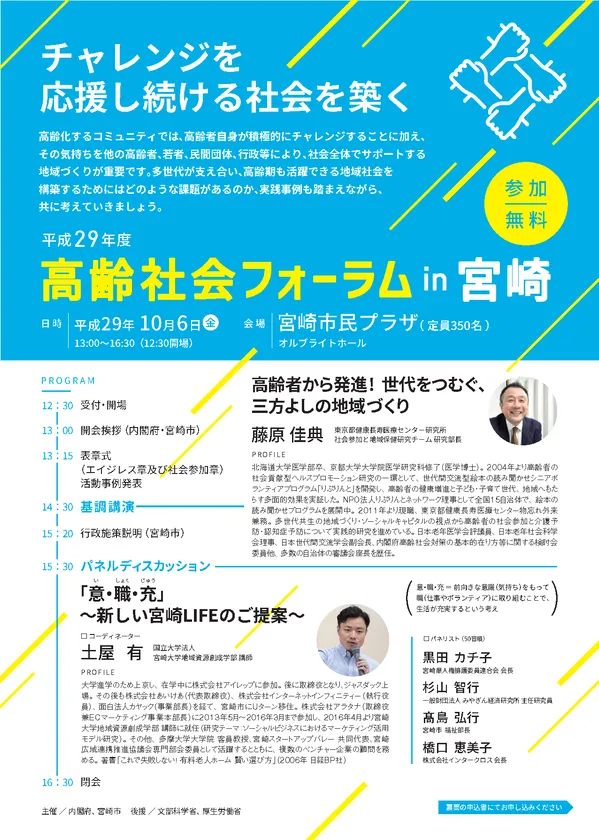 宮崎市は、内閣府とともに、高齢者の“チャレンジを応援し続ける社会を築く”ことをテーマに、2017年10月6日に「高齢社会フォーラム in 宮崎」を開催します。