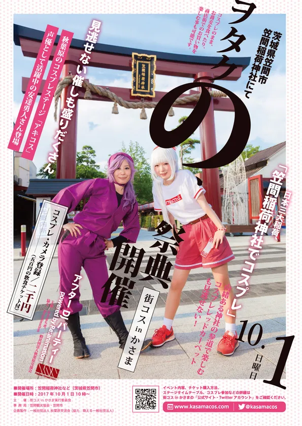 街コスinかさま実行委員会は、秋の一大イベントであり今年110回を迎える日本最古の「菊まつり」を盛りあげるためのプレイベントとして、2017年10月1日(日)、笠間稲荷神社と笠間稲荷門前通り商店街でコスプレイベント、アイドルライブ、アニソンDJやレッドカーペットなどのヲタクの祭典『街コスinかさま』を開催いたします。