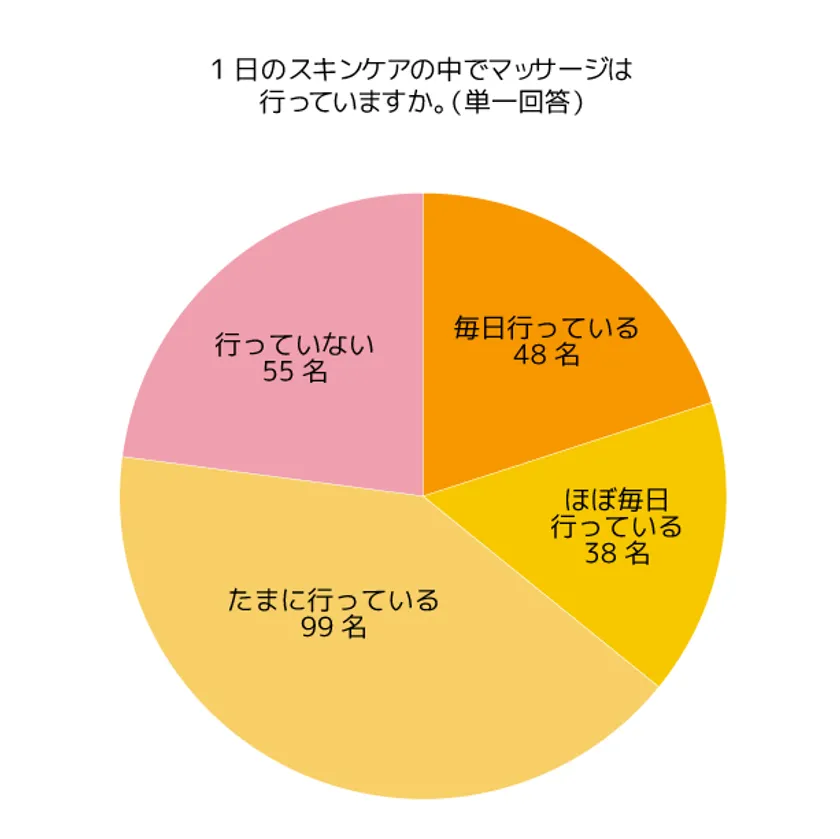 「朝」が18名、「夜」が139名、「朝と夜」が28名という結果でした。ほとんどの方が、夜のスキンケアの一環でマッサージを行っていることが伺えます。