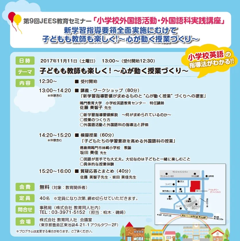 小学校英語の指導法がわかる!第9回JEES教育セミナー 「小学校外国語活動・外国語科実践講座」を11月11日開催