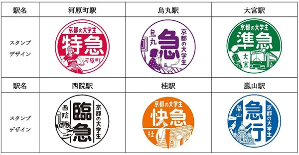 今回は、くるりの楽曲『京都の大学生』の歌詞と阪急電車のヘッドマークをイメージしてデザインしたスタンプを集めてめぐるラリーで、“京都学生広報部”(別紙参照)の協力を得て選定した阪急京都線の6駅周辺のお店にスタンプを設置します。