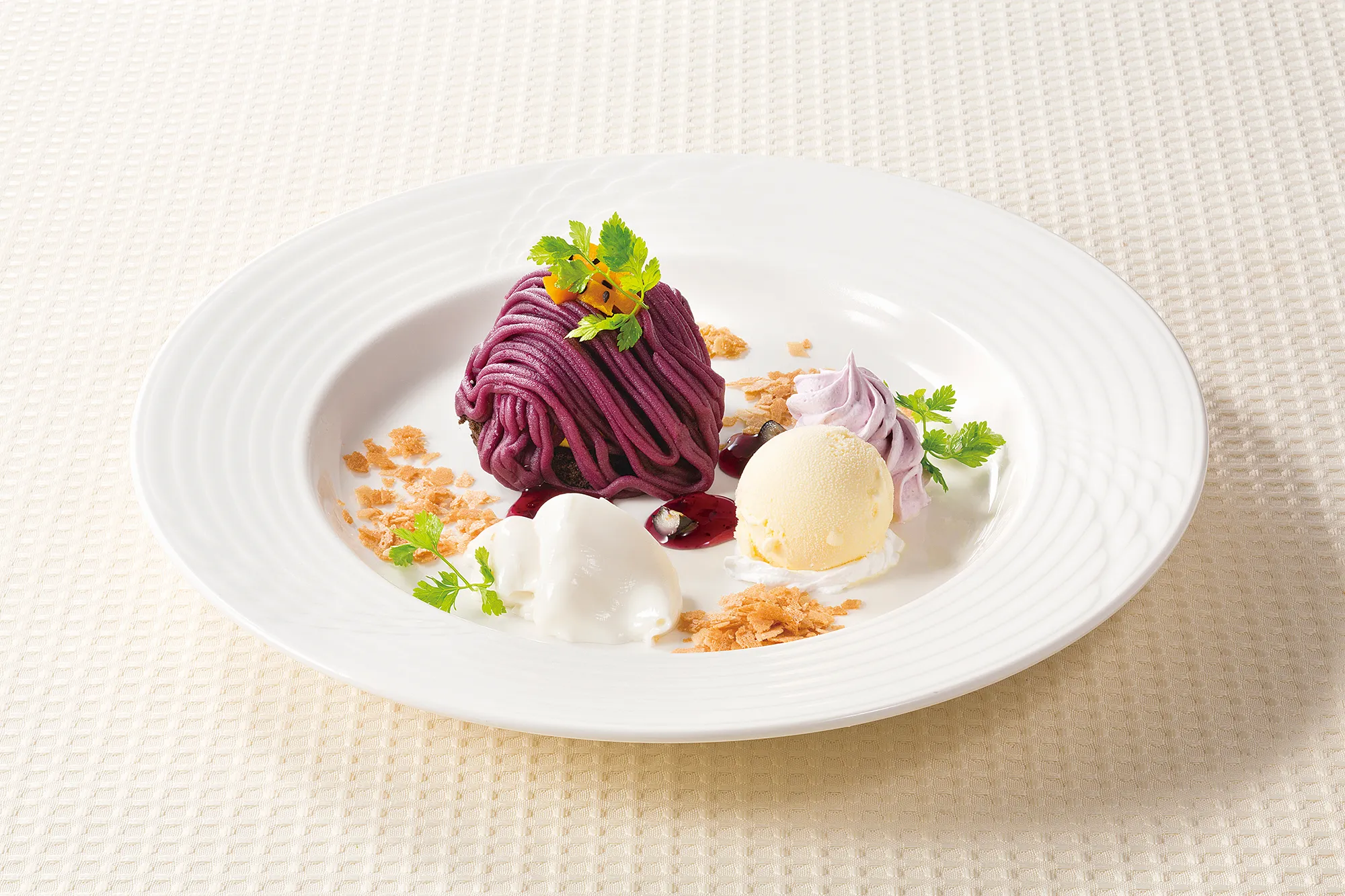 季節感溢れるモンブラン。バニラアイス、パンナコッタを添え