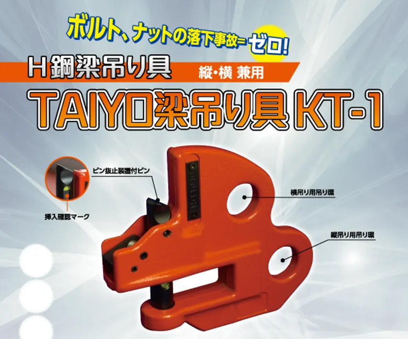 この度の製造・販売事業を譲り受けにより、H鋼梁吊り具「KT-1」がTAIYO製品のラインナップに加わり、さらに“玉掛け作業を もっと安全に もっと効率よく”行っていただけるようにご提案してまいります。