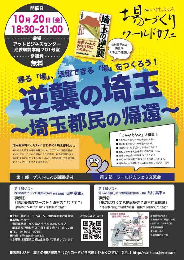 共助コーディネーター養成講座実行委員会(所在地:埼玉県杉戸町、代表:小川 清一)は、ゲストが提供した埼玉に関する話題に対し、参加者同士で意見交換する交流会「逆襲の埼玉 ~埼玉都民の帰還~」を2017年10月20日(金)に池袋で開催します。