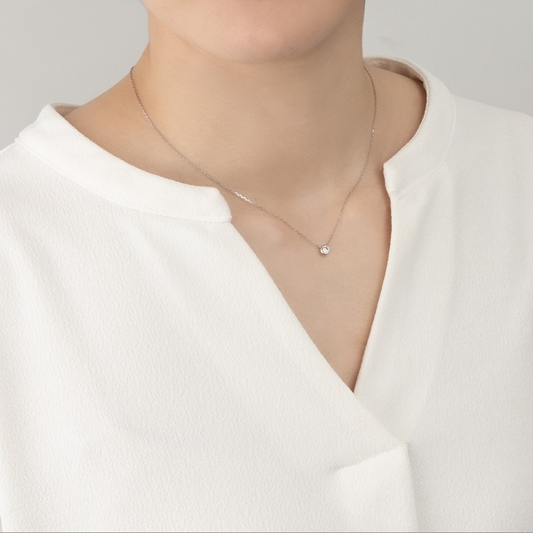 ダイヤモンドを丸く包み込むようにセットする覆輪留めのデザインで、引っかかりがなく普段使いしやすいネックレス。(写真は両引きタイプ)