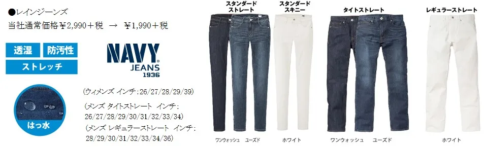 また、雨の日にも最適なレインジーンズもおすすめです。ジーンズ全体に、水や汚れのしみこみを防止する超はっ水加工を施しています。秋の行楽での、突然の雨でも安心です。